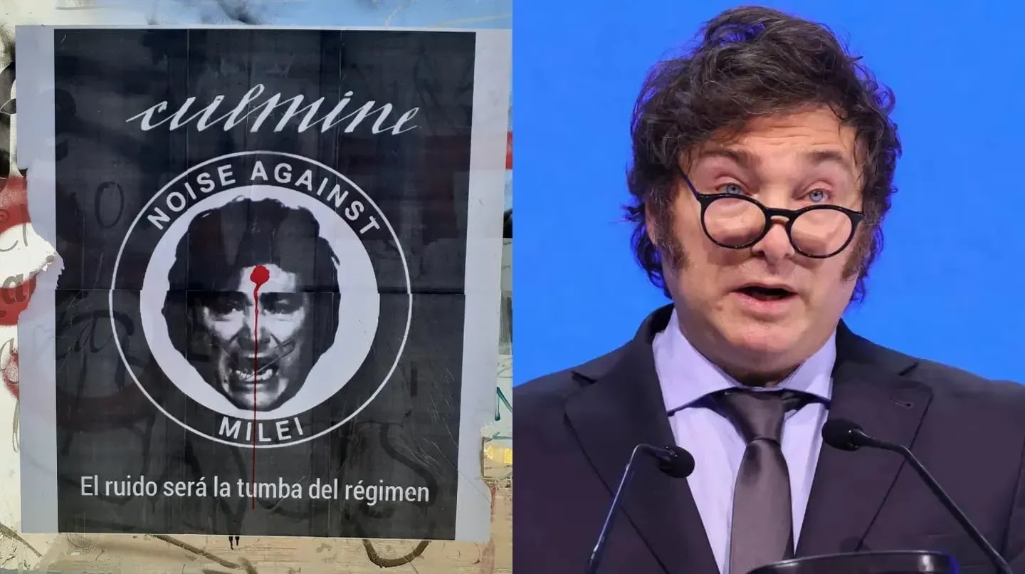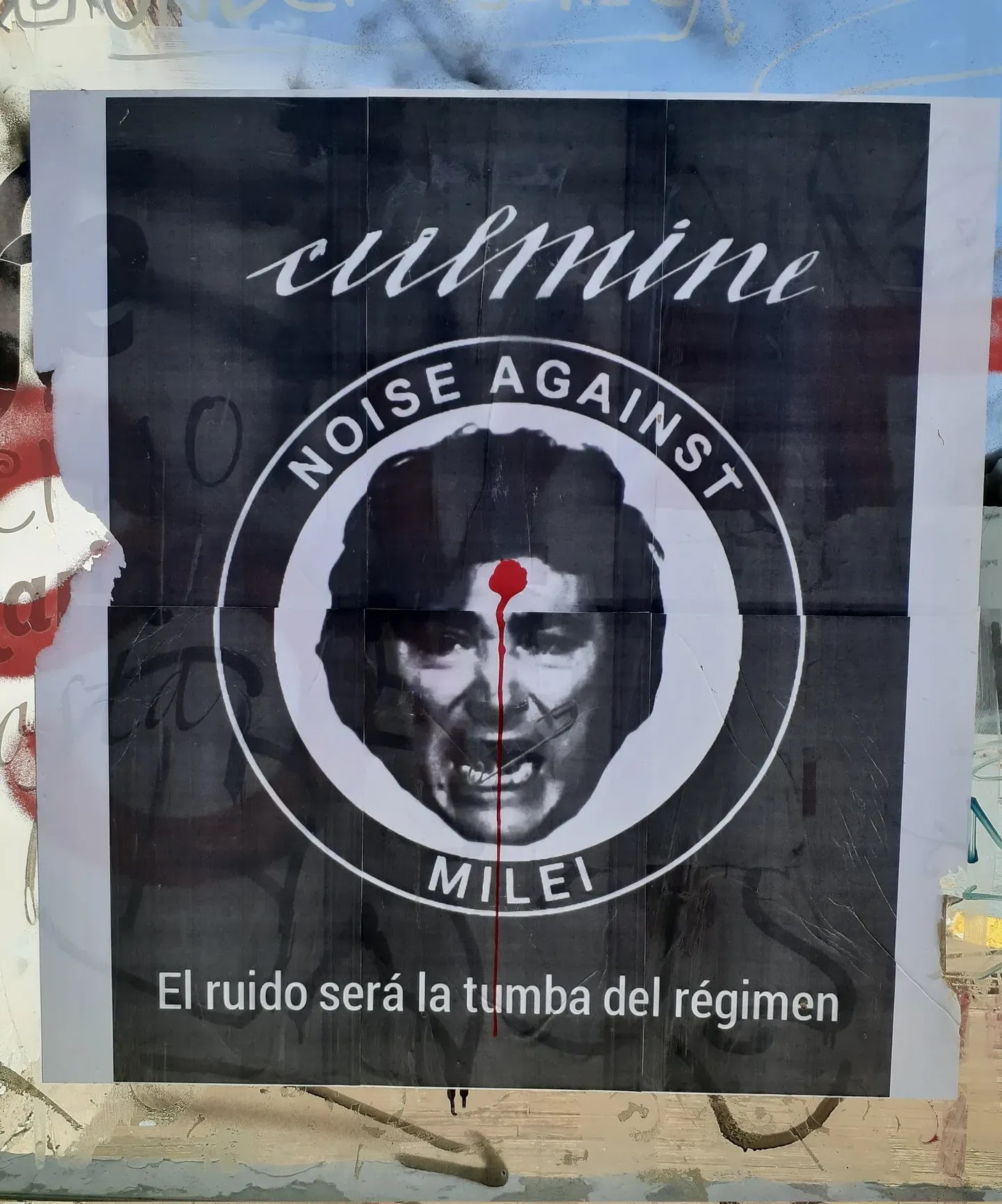 El cartel viene acompañado de dos frases con un mensaje similar. La primera, en castellano, dice “el ruido será la tumba del régimen”. Mientas que la segunda está escrita en inglés y dice “noise against Milei” (ruido contra Milei).