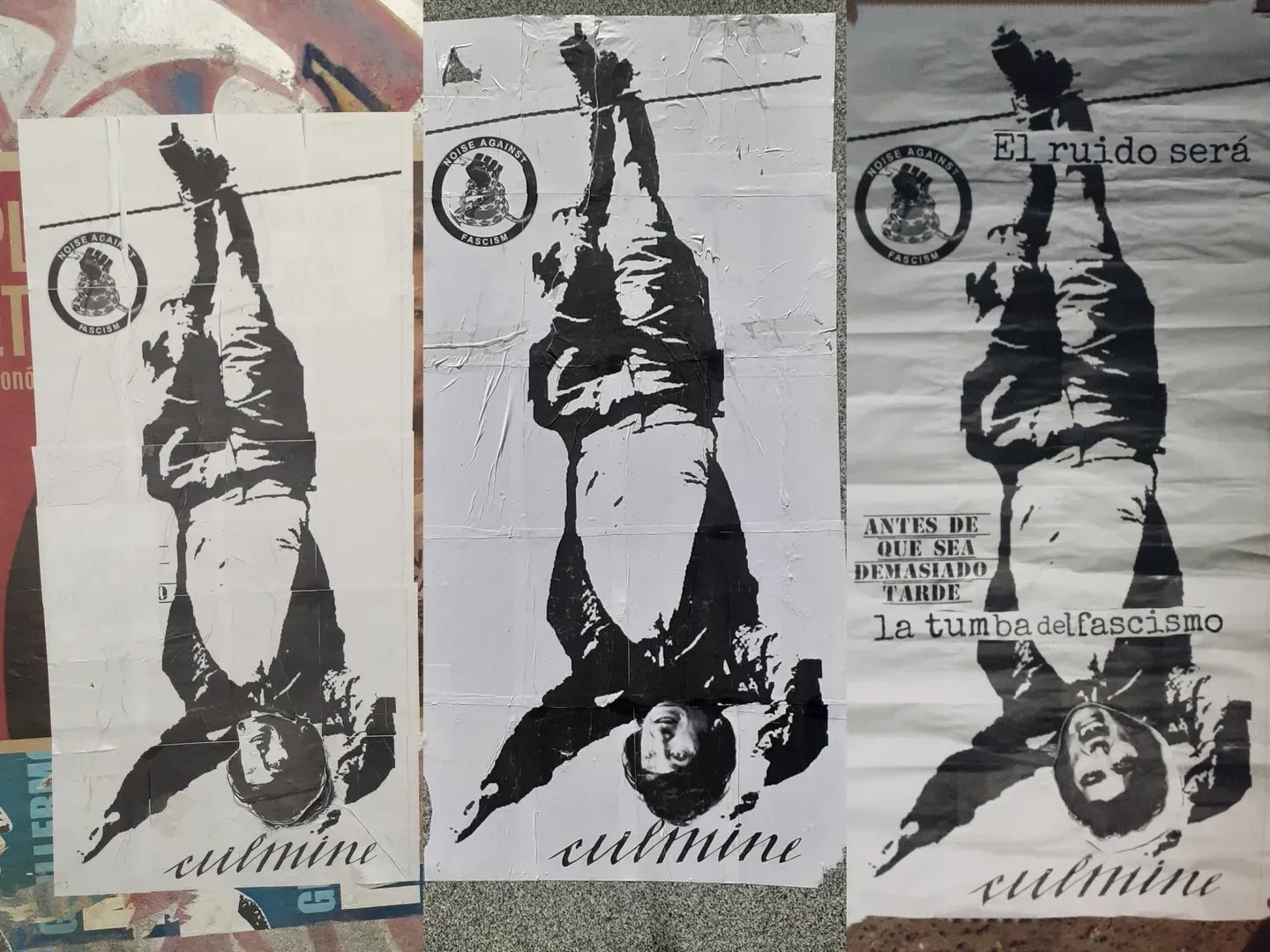 “Antes de que sea demasiado tarde”, es una de las frases que aparece en los afiches pegados en una pared. La amenaza viene acompañada de una imagen en la que un hombre con la cara de Milei aparece colgado de los pies y otra frase: “El ruido será la tumba del fascismo”.