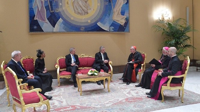 Tras la reunión a solas, se tomó una foto oficial y hubo un saludo del pontífice a los integrantes de la comitiva oficial, así como intercambio de obsequios, lo que se extendió hasta las 10.35 hora de Roma.