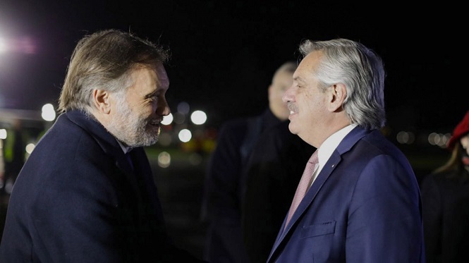El Presidente está acompañado por la primera dama, Fabiola Yañez; los ministros de Relaciones Exteriores, Comercio Internacional y Culto, Santiago Cafiero; de Agricultura, Ganadería y Pesca, Julián Domínguez; de Ambiente y Desarrollo Sostenible, Juan Cabandié; y de Desarrollo Productivo, Matías Kulfas; la secretaria de Relaciones Económicas Internacionales, Cecilia Todesca; el secretario General de la Presidencia, Julio Vitobello; el Jefe de Gabinete de Asesores, Juan Manuel Olmos; la portavoz de la Presidencia, Gabriela Cerruti; la asesora presidencial, Cecilia Nicolini; y el subsecretario de Comunicación y Prensa, Marcelo Martín.