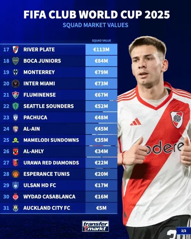 El Millonario ocupa el puesto 17 del ranking con una cotización total de 113 millones de euros, mientras que el Xeneize se encuentra en la posición 18 con 84 millones de euros. En tanto, el conjunto de Florida aparece recién en el puesto 20, con un valor de mercado de 73 millones de euros, lo que demuestra que las grandes figuras no lograron equiparar el valor global del plantel.