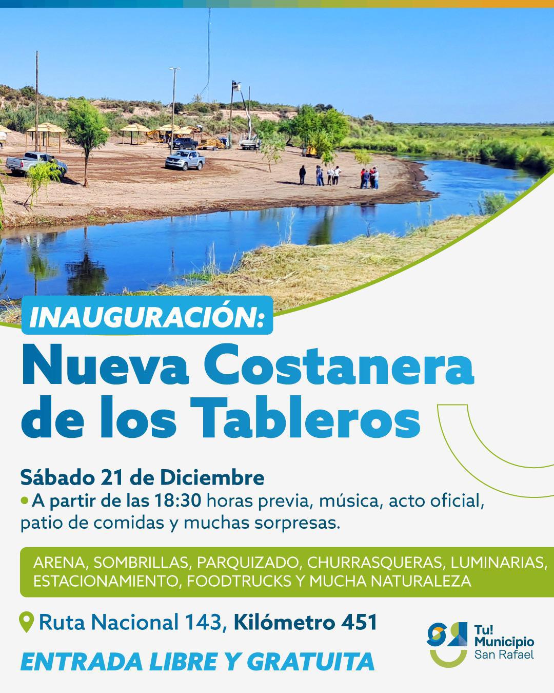 Con una gran fiesta popular, el Municipio de San Rafael inaugurará el próximo sábado la nueva costanera que construyó a la vera del río del Atuel, sobre la ruta nacional 143 a la altura del paraje “Los Tableros”, entre Jaime Prats y Real del Padre.