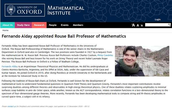 Fernando Alday ha sido nombrado profesor de Matemáticas Rouse Ball en la Universidad de Oxford. La Cátedra de Matemáticas Rouse Ball es una de las cátedras superiores del Departamento de Matemáticas de Oxford (y también de Cambridge).