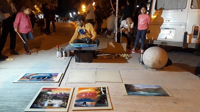 Hoy estoy en una feria con gente conocida, gente muy buena que me brinda lo mejor y disfruto de mi arte, de poder hacerlo en la calle y que la gente disfrute de esta pintura que por ahí es muy llamativa.