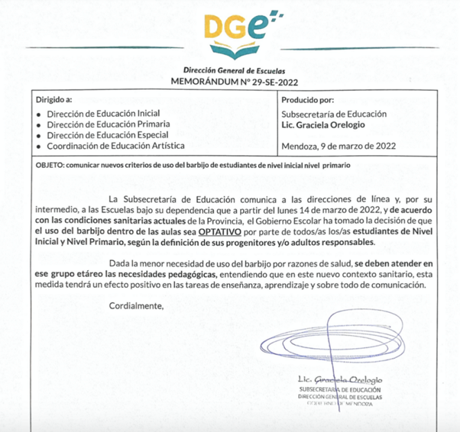 “Dada la menor necesidad de uso de barbijo por razones de salud, se deben atender en ese grupo etario las necesidades pedagógicas, entendiendo que en este nuevo contexto sanitario esta medida tendrá un efecto positivo en las tareas de enseñanza, aprendizaje y sobre todo de comunicación”, argumenta la misiva que lleva la rúbrica de la Subsecretaria de Educación Graciela Orelogio.