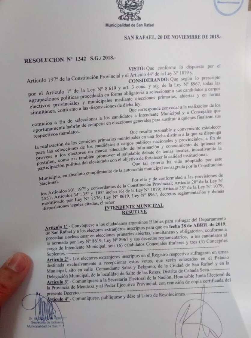 Según figura en la resolución 1342 de la comuna, firmada por las autoridades del departamento, las Primarias Abiertas, Simultáneas y Obligatorias se realizarán el 28 de abril de ese año, para intendente/a y concejales.