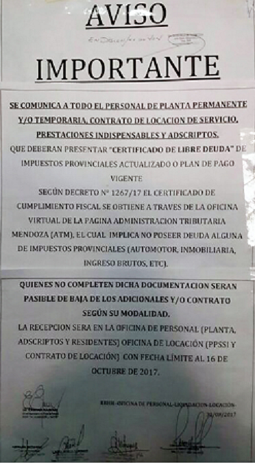 Los empleados públicos de Mendoza no podrán llegar a octubre de este año sin haberse puesto al día con sus impuestos provinciales (inmobiliario, automotor, planes de pago), porque de lo contrario podrían perder sus adicionales como horas extras, o mayor dedicación, o aún podrían caerse los contratos de locación de servicios, para aquellos que ingresan en esa modalidad de relación con el Estado.