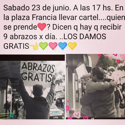 Este sábado se realizará un evento denominado “Abrazos gratis” en plaza Francia y el Parque de los Niños, que es de carácter internacional, consistente en ofrecerle abrazos a desconocidos como muestra de afecto.