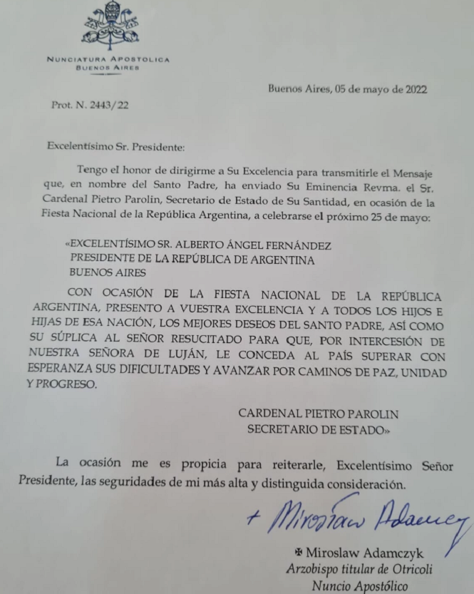 “Con ocasión de la fiesta nacional de la República Argentina, presento a vuestra excelencia y a todos los hijos y hijas de esa Nación, los mejores deseos del Santo Padre”, indica la carta que lleva la firma del cardenal secretario de Estado de la Santa Sede, Pietro Parolin.