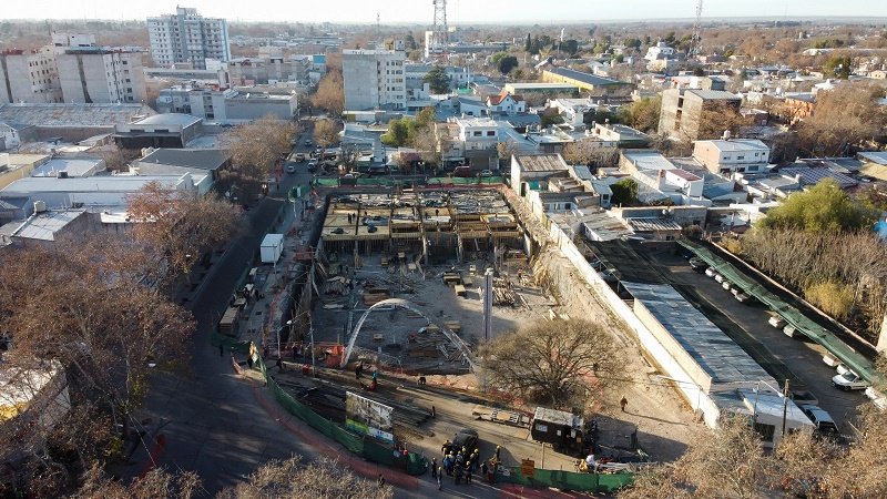 Con un impresionante movimiento de obreros, continúa la construcción del centro comercial, cultural y tecnológico donde funcionó la terminal de colectivos de San Rafael.