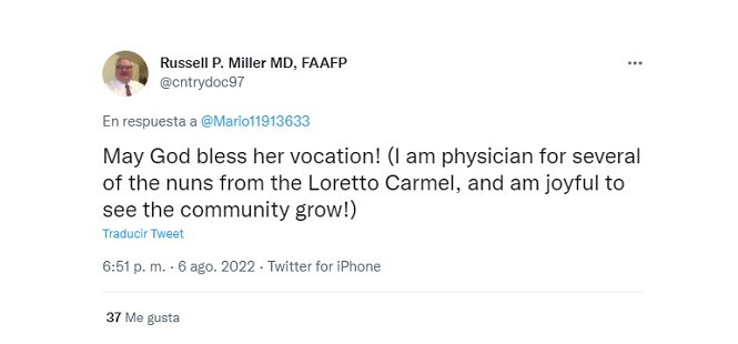 El testimonio inspiró a muchos fieles en Twitter. Un usuario expresó: “¡Que Dios bendiga su vocación! (Soy médico de varias de las monjas del Carmelo de Loretto, y me alegro de ver crecer la comunidad!)”.