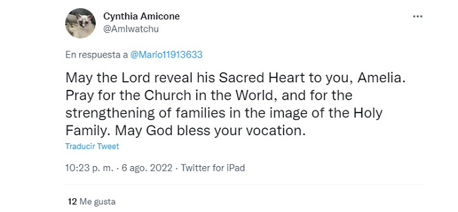 Finalmente otra usuario expresó: “Que el Señor te revele su Sagrado Corazón, Amelia. Oren por la Iglesia en el Mundo, y por el fortalecimiento de las familias a imagen de la Sagrada Familia. Que Dios bendiga tu vocación”.