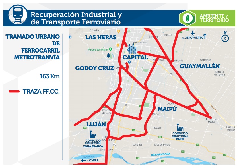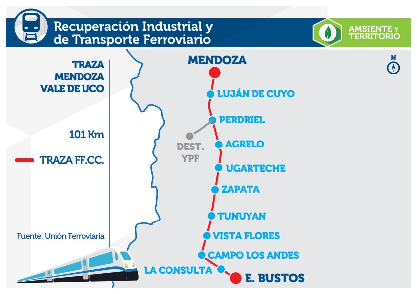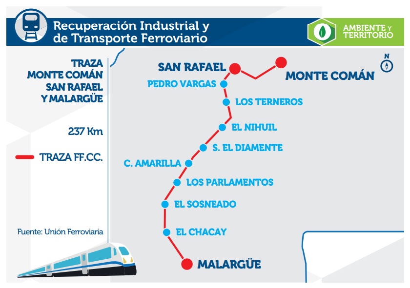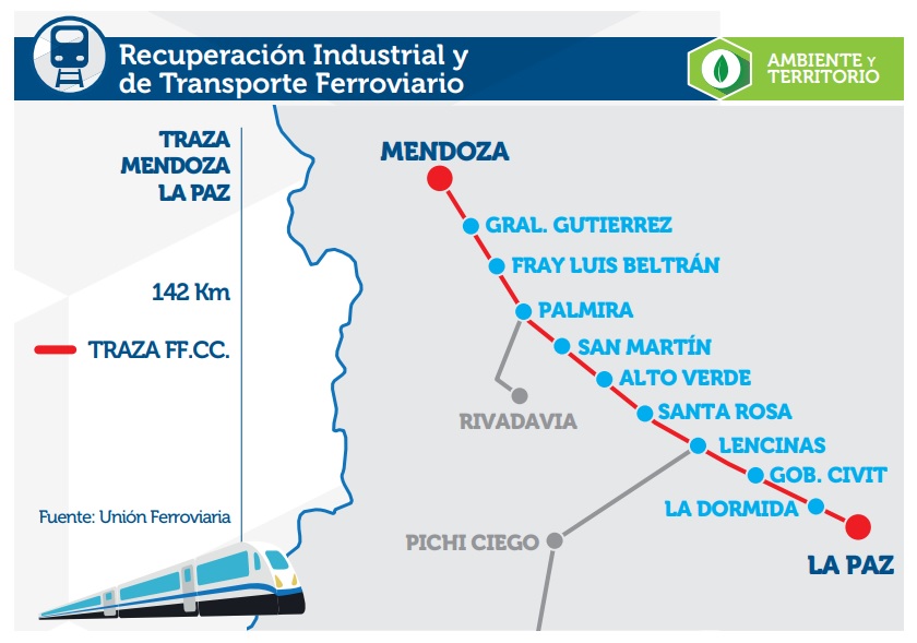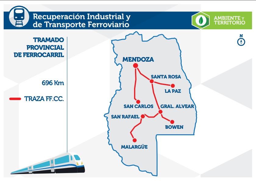 Para concretar las acciones previstas, el proyecto de ley prevé volver a hacer funcionar unos 800 kilómetros de ramales ferroviarios en toda la provincia así distribuidos: 63km del Gran Mendoza, 172km de Ciudad de Mendoza-La Paz de, incluyendo la variante Rivadavia; 149km de Las Catitas-Monte Comán, 67km de Monte Comán-General Alvear-Bowen, 237km de Monte Comán-San Rafael-Malargüe y 101km Ciudad de Mendoza-Eugenio Bustos.