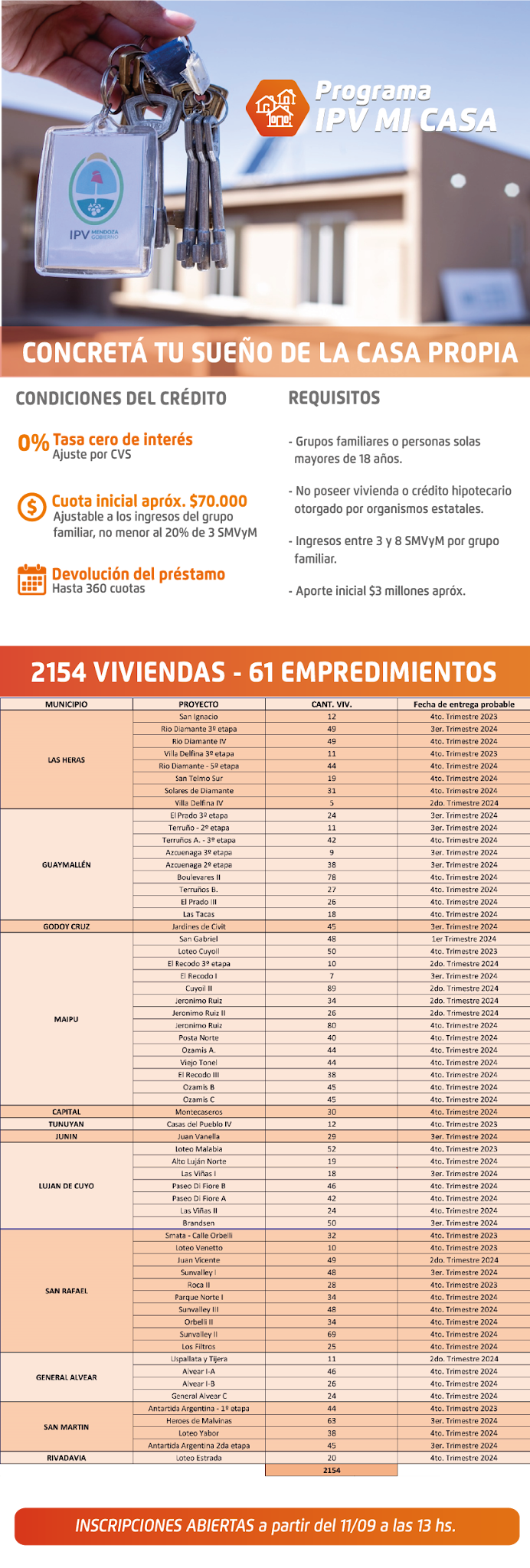 Las inscripciones para este programa comenzarán a las 13:00 horas de este lunes, con un total de 2.154 viviendas en juego. Estas viviendas se encuentran distribuidas en 61 barrios ubicados en 12 departamentos de la provincia.