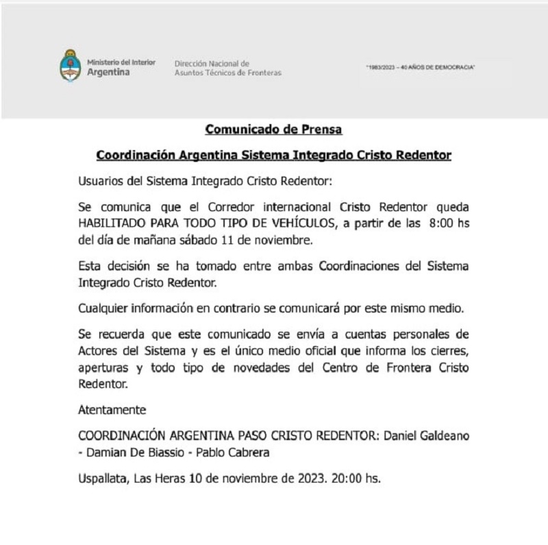 La coordinación argentina emitió un comunicado de prensa para informar sobre esta reapertura. Según el comunicado, a partir de las 8:00hs del sábado 11 de noviembre, se restablecerá el paso para todo tipo de vehículos. Se insta a los conductores a circular con precaución y mantenerse informados a través de las vías oficiales proporcionadas por ambas coordinaciones.