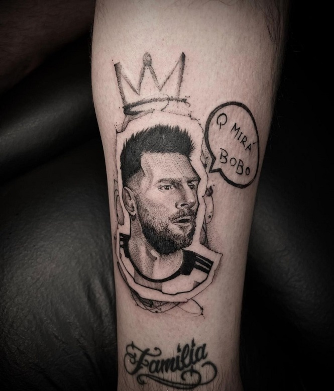 El tattoo de Messi el hincha se lo hizo en el gemelo de su pierna derecha. Por la hora en la que el tatuador, Facundo Musa, subió la publicación, el tatuaje fue hecho promediando la medianoche del mismo día del partido, apenas ¡seis horas después del final de la tanda de penales!