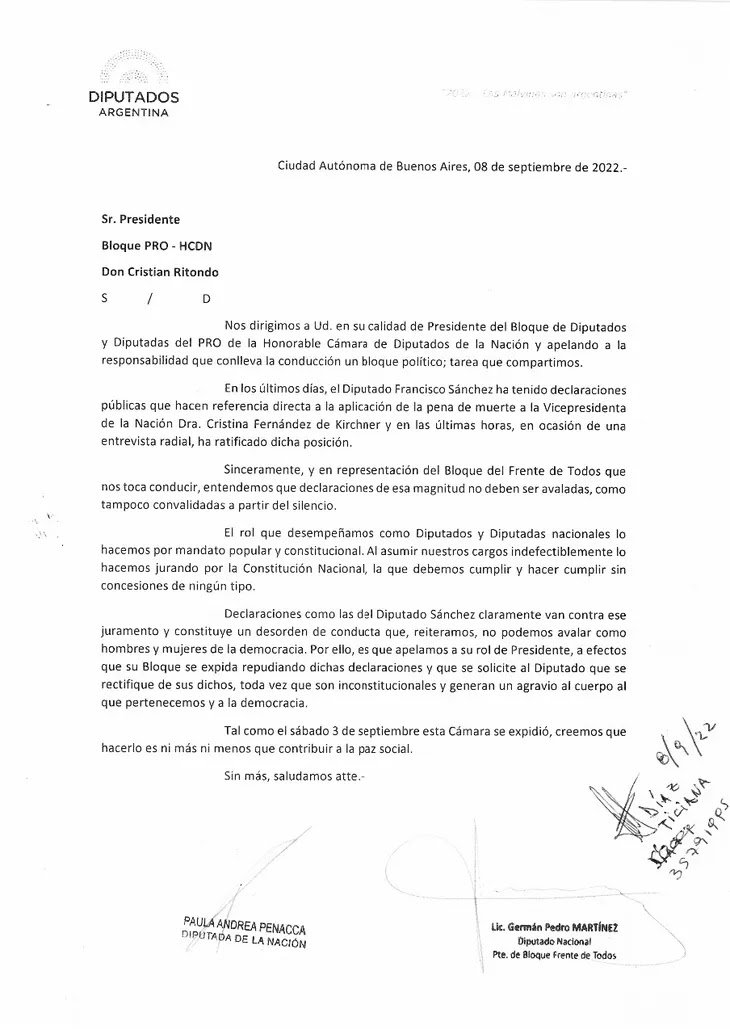 Este jueves, el presidente del bloque de Diputados del Frente de Todos, Germán Martínez, elevó dos cartas, dirigidas a Patricia Bullrich y a Cristian Ritondo. La misiva remarca que “declaraciones como las de Francisco Sánchez van contra el mandato constitucional” y son “un desorden de conducta”.