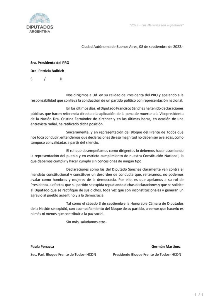 El bloque de Diputados del FdT envió dos notas a Patricia Bullrich (presidenta del PRO) y a Cristian Ritondo (presidente del bloque) para repudiar y condenar los dichos del diputado neuquino Francisco Sánchez. El legislador de JxC había pedido la “pena de muerte” contra la vicepresidenta Cristina Kirchner, en el marco del juicio de la causa Vialidad.