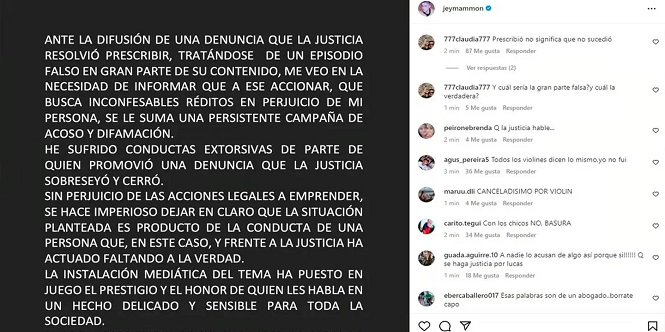 El humorista Jey Mammon se refirió a estas acusaciones, y el jueves por la tarde adelantó que podría tomar cartas en el asunto. El músico publicó un comunicado donde detalla que está evaluando la posibilidad de llevar a la Justicia a Lucas Benvenuto, el joven que lo señaló los últimos días como su abusador.