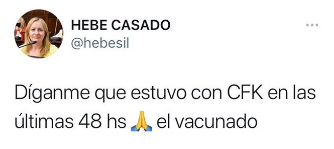 Los comentarios de la médica inmunóloga y diputada del PRO, Hebe Casado, fueron ampliamente repudiados por dirigentes de todo el arco político. La legisladora publicó en la red social Twitter un mensaje expresando su deseo de que la vicepresidenta, Cristina Kirchner, se contagie con Covid-19. Muchos seguidores pidieron su renuncia o un pedido de disculpas pero ella subió la apuesta.