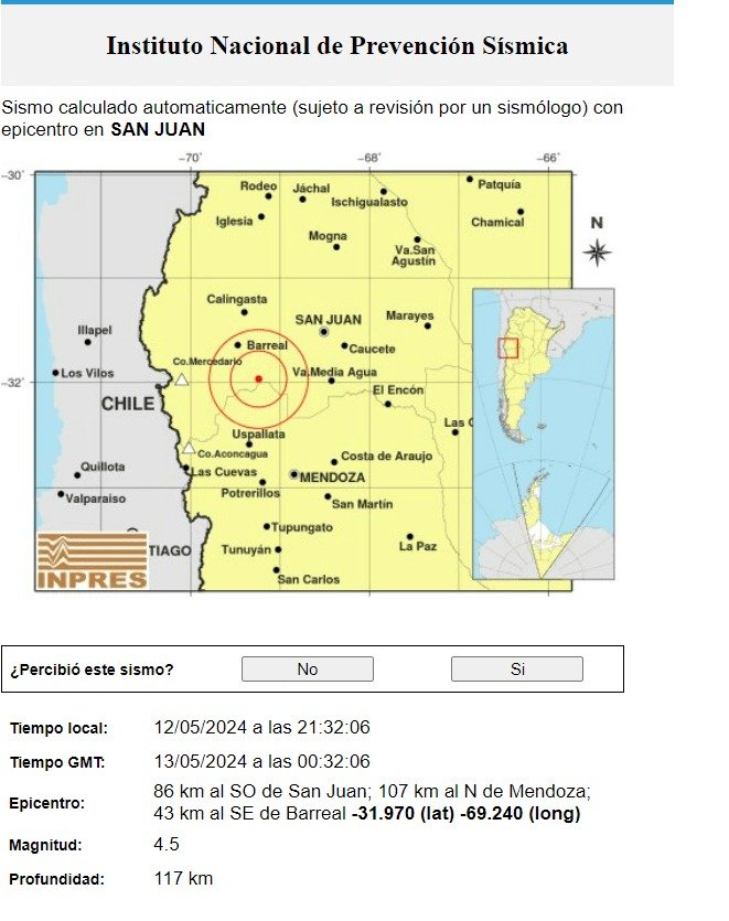 El epicentro se localizó a 107 kilómetros al norte de Mendoza y a 86 kilómetros al suroeste de San Juan.