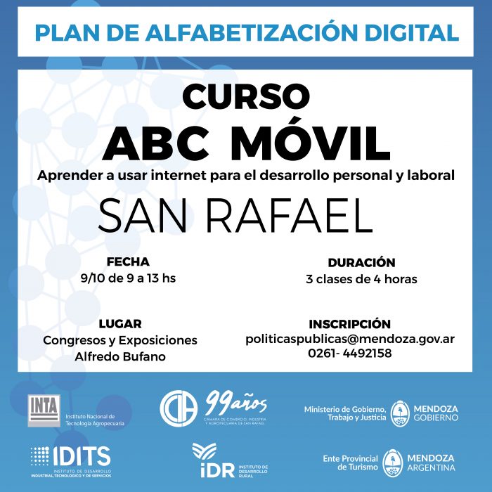 En el marco del Plan de Alfabetización Digital, el director de Políticas Públicas e Innovación, Rubén Zavi, participará el 9 de octubre en el curso “ABC Móvil”. La capacitación se desarrollará en San Rafael y está destinada a productores y a todos los ciudadanos interesados en el uso de herramientas digitales para la comercialización.