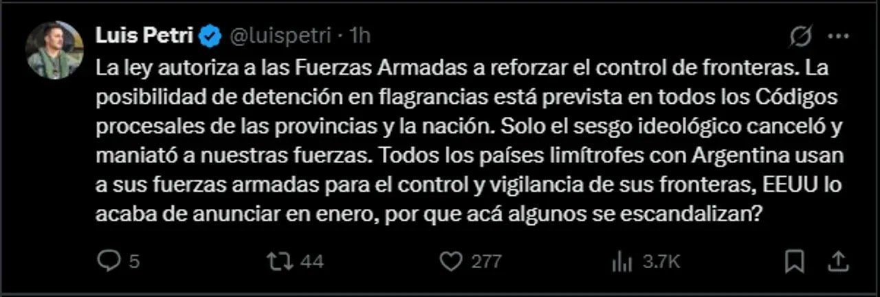 El Gobierno Nacional autorizó a los militares a detener civiles en forma transitoria que hayan cometido delitos de flagrancia, según confirmó Luis Petri. “Sí, es una medida controversial para todos los que defienden narcos, terroristas y violentos delincuentes. Elijan de que lado van a estar”, expresó en su cuenta de X.