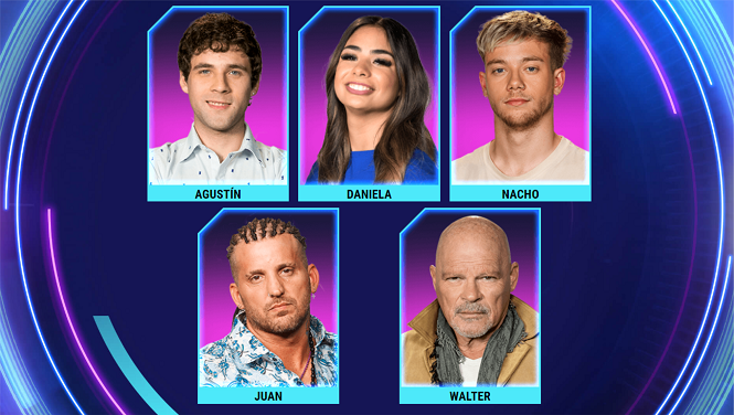 Juan, Alfa, Daniela, Nacho y Agustín son los nominados. Esta semana no hubo salvados, ya que La Tora, que fue la líder, fue sancionada por la producción y se le quitó el beneficio obtenido.
