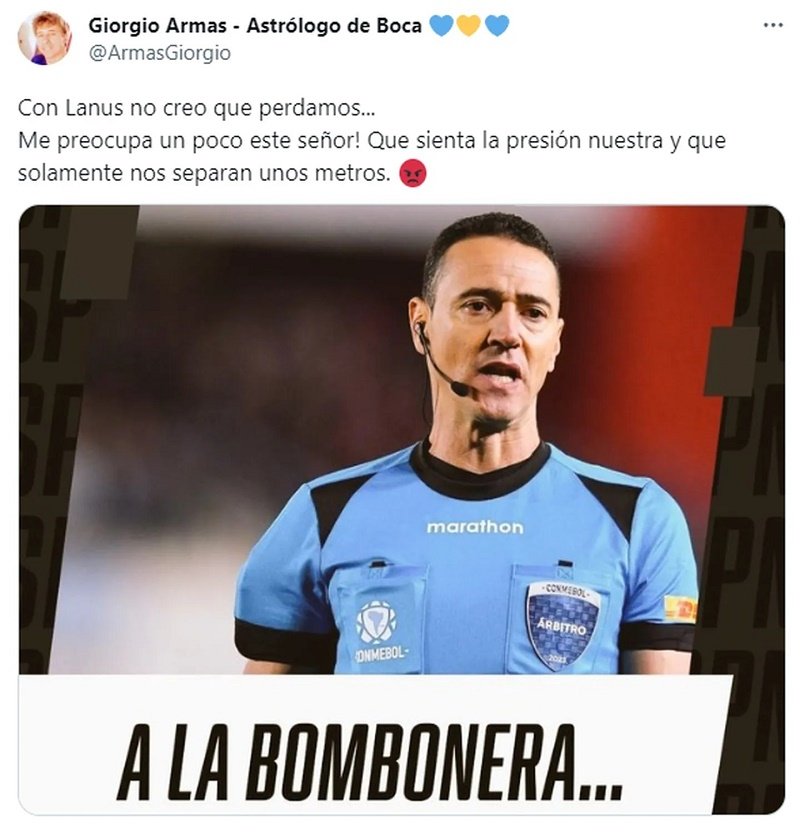 Boca ya sabe que el árbitro del partido de ida de las semifinales ante Palmeiras por Copa Libertadores será Wilmar Roldán. Luego de que se confirme la presencia del colombiano en la Bombonera, Giorgio Armas, el astrólogo del Xeneize, mostró su preocupación por la designación por parte de Conmebol.