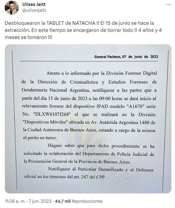 Luego de 4 años de investigación a cargo de la Justicia de San Isidro, Gendarmería Nacional, logró abrir el iPad que Natacha Jaitt llevaba consigo al momento de su muerte el 23 de febrero del 2019. La fuerza federal realizó, durante todo este tiempo, miles de intentos fallidos. Sin embargo, en las últimas horas, gracias a una nueva clave adquirida en el exterior, se logró destrabar el dispositivo.
