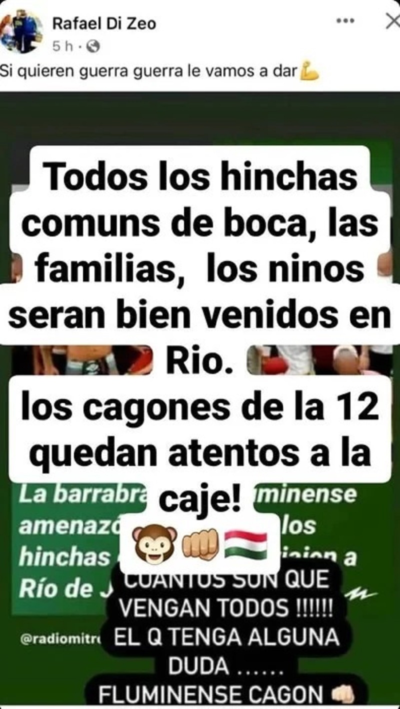 A su vez, ambas barras se enfrentaron en redes sociales, ya que los de Fluminense publicaron que no van a atacar a hinchas comunes ni a niños pero a los “cobardes de la 12” si, a lo que Rafael Di Zeo les declaró la guerra.