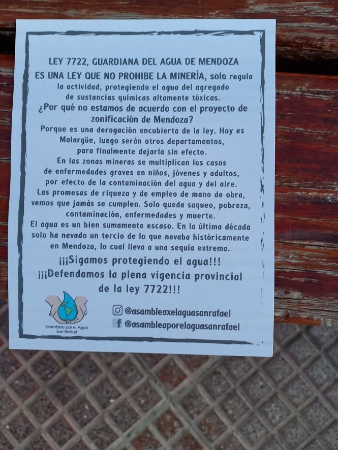 Desde el movimiento Lucha, Tierra y Agua, habían invitado a la comunidad en general a participar de un “festejo” que se desarrolló en la plaza Francia de San Rafael, pues la fecha coincide con el número de la ley, tan defendida por gran parte de la sociedad y cuestionada por otros. Los organizadores expresaron que el 7/7/22 “se trata de una fecha única que coincide con una ley que consiguió el pueblo de Mendoza en las calles”, razón por la cual se invitaba al vecino a que se sume con la familia a festejar, a compartir un momento ya que “algo que tenemos todos los mendocinos es nuestra preciada agua”.