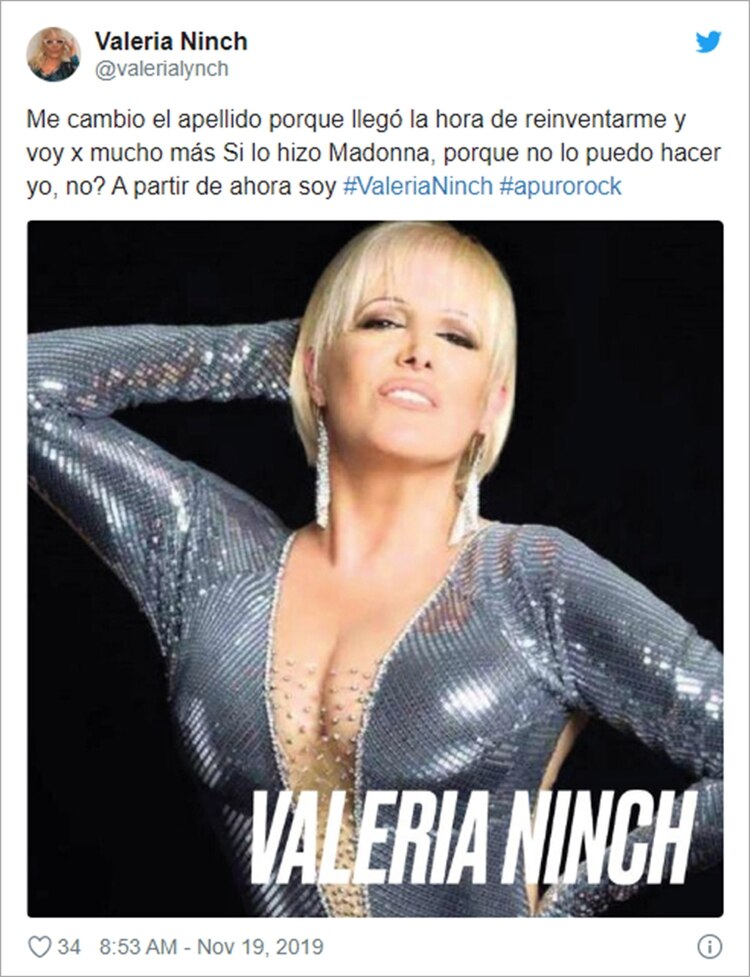 “Me cambio el apellido porque llegó la hora de reinventarme y quiero ir por más. Si lo hizo Madonna por qué no lo puedo hacer yo?. A partir de ahora soy #ValeriaNinch #MuchoRock”, declaró la cantante entre risas.