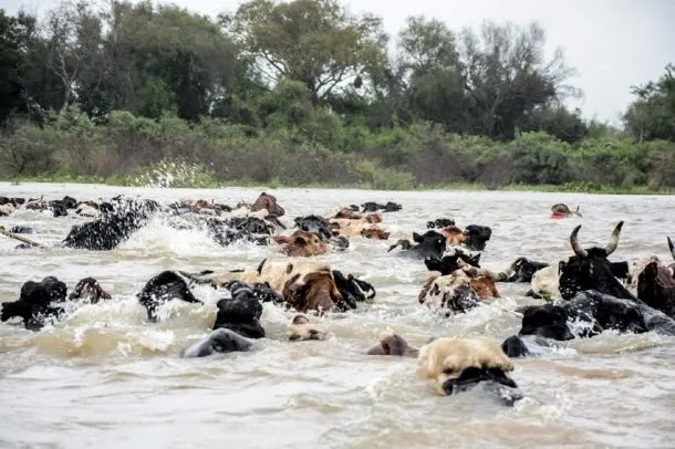 Las imágenes de los animales en el agua buscando cruzar hasta tierra firme es impactante y desesperante. Un productor con su caballo se arrojó a las aguas del Paraná para salvar el mayor porcentaje de su ganado. Mientras tanto el clima sigue castigando. La lluvia, el fuerte viento y la baja temperatura complican la tarea de salvataje.