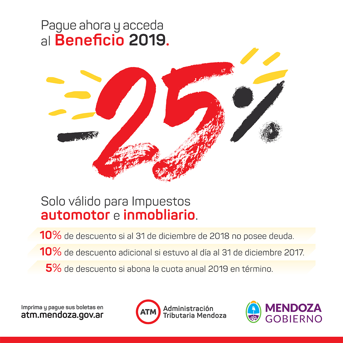 La Administración Tributaria Mendoza (ATM) informó los beneficios que dispondrán los contribuyentes para el pago de los impuestos Inmobiliario y Automotor durante el calendario de vencimientos 2019. Se podrá obtener hasta 25% de descuento.