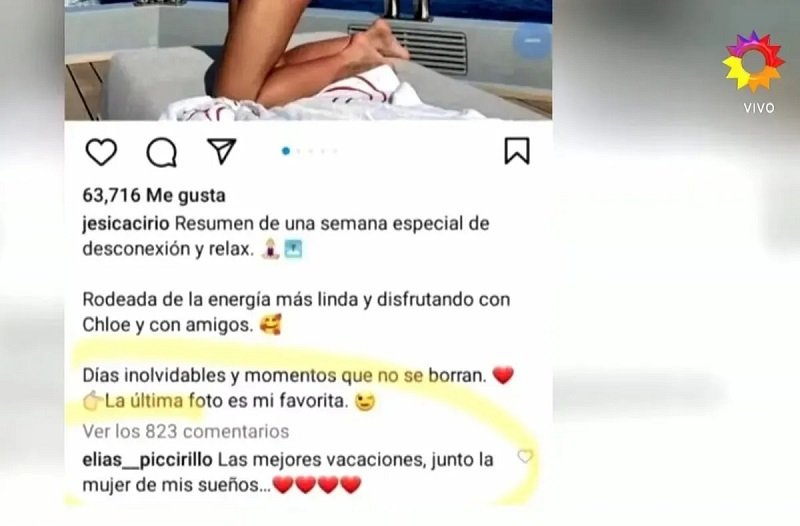 “La foto de Jésica tiene 63 mil me gusta. Y dice Elias_Piccirillo dice ‘Las mejores vacaciones, junto a la mujer de mis sueños’”, leyó el conductor, confirmando así la identidad de la nueva pareja de la conductora de La peña de morfi (Telefe).
