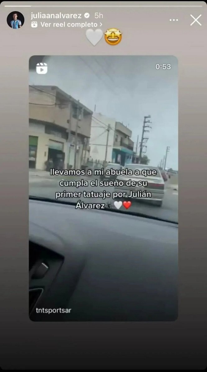 Nazareno Couchot compartió, a través de sus redes sociales, el video de su abuela, Norma, quien se realizó un tatuaje en honor al jugador de Manchester City. “Llevamos a mi abuela a que cumpla el sueño de su primer tatuaje por Julián Álvarez”, escribió para acompañar las imágenes. La mujer hizo la promesa durante la Copa del Mundo junto a otro de sus nietos.