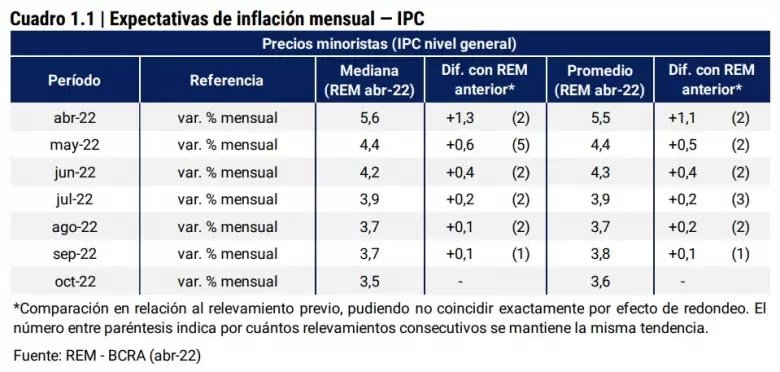 Además, estimaron que la variación de precios para 2022 se ubicará en 65,1%, lo que marcó una suba de 5,9 puntos porcentuales (p.p.) respecto de la encuesta realizada a fines de marzo. Si ese 65,1% se concreta finalmente, sería 15 puntos superior a la de 2021 y la variación anual más alta desde 1991.