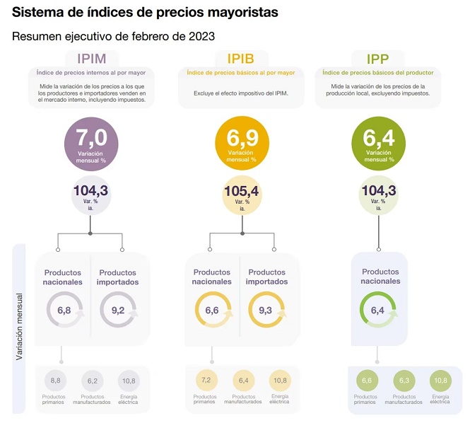 - El más representativo es el índice de precios internos al por mayor (IPIM), que mide la variación de los precios a los que los productores e importadores venden en el mercado interno, incluyendo impuestos. Este mostró un alza de 7% en febrero y una variación interanual de 104,3%.
