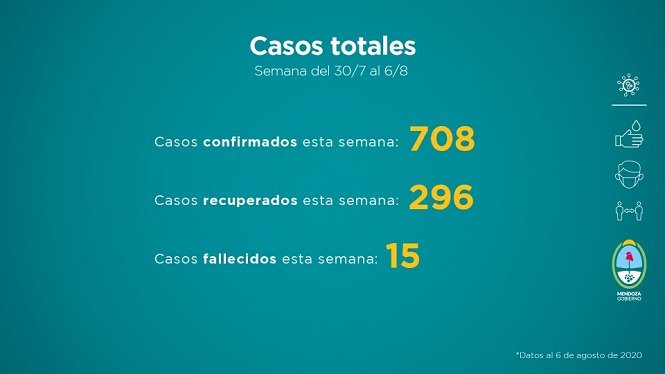 Al jueves 6 de agosto, a las 20.40 horas, la cantidad de casos confirmados en la semana del 30 de julio al 6 de agosto es de 708 confirmados, 296 recuperados y 15 fallecidos.