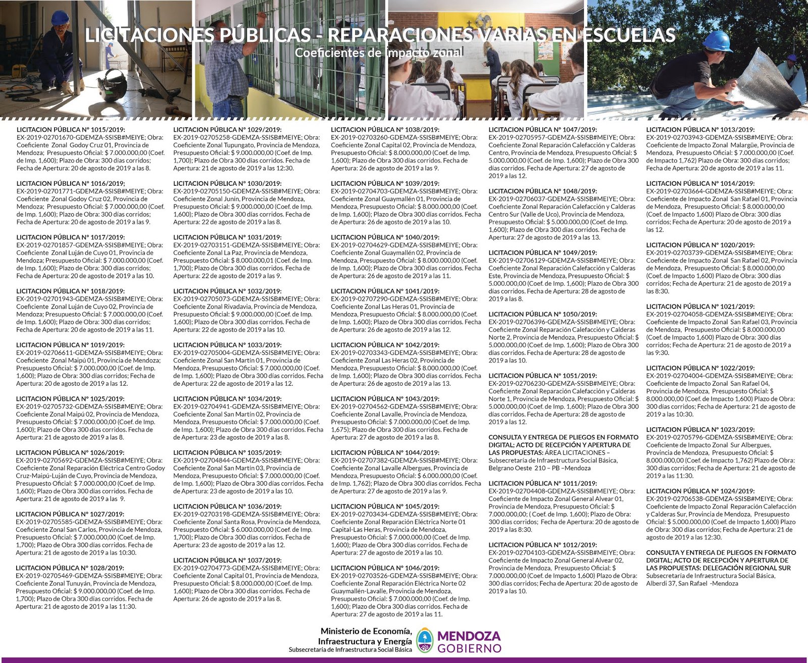Para las escuelas del Gran Mendoza, Zona Este y Valle de Uco, las aperturas de sobres se realizarán en el área de licitaciones de la Subsecretaría de Infraestructura Social Básica ubicada en la calle Belgrano 210, PB, de Capital. Mientras que para los establecimientos de la zona Sur, las aperturas se efectuarán en la calle Alberdi 37, de San Rafael.