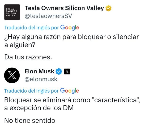 Sólo quedará disponible para bloquear mensajes directos. Según Musk, la opción de bloquear “no tiene sentido” y por eso decidió eliminarla. Además, señaló que sí se podrá silenciar cuentas.