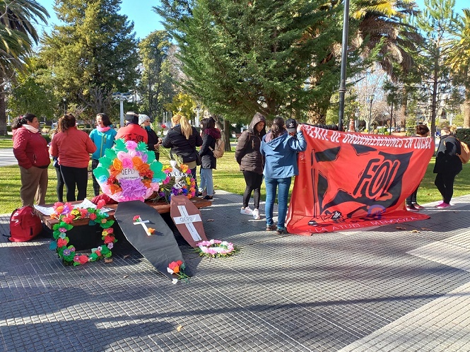 Los integrantes del FOL desarrollaron –dijo Muñoz– “una marcha simbólica en representación de lo que es la pérdida del mínimo vital y móvil”. “¿Por qué pérdida? Porque la situación en la que nos encontramos, en la que tenemos una inflación demasiado elevada donde hay una pérdida de lo que son los precios en las góndolas, tanto del faltante o del aumento de los precios, es imposible para nosotros. El vital y móvil se encuentra en 40 y cada uno de nosotros, siendo cooperativistas y trabajando todos los días, cobramos la mitad y eso significa que nos encontramos por debajo de la línea de pobreza”, señaló y agregó: “Nos plantamos acá frente al municipio, porque no tenemos otro lugar donde hacerlo, en reclamo a las necesidades que está pasando el pueblo”.