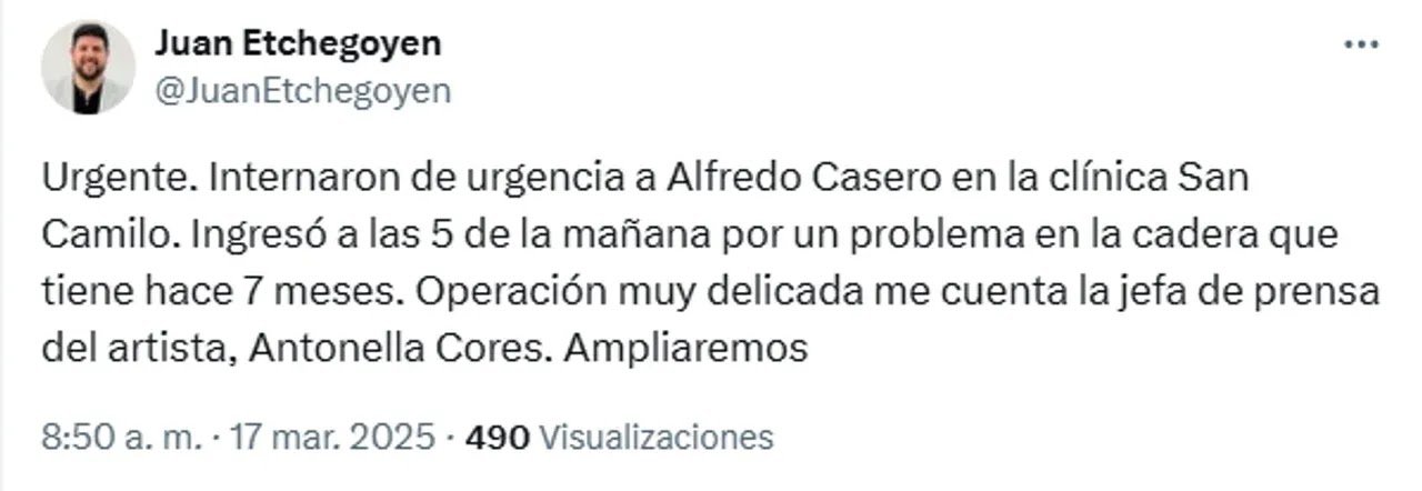 “Hace meses que Casero viene con este problema en la cadera, de hecho este es el motivo de por qué suspendió las funciones de su espectáculo”, agregó Etchegoyen.