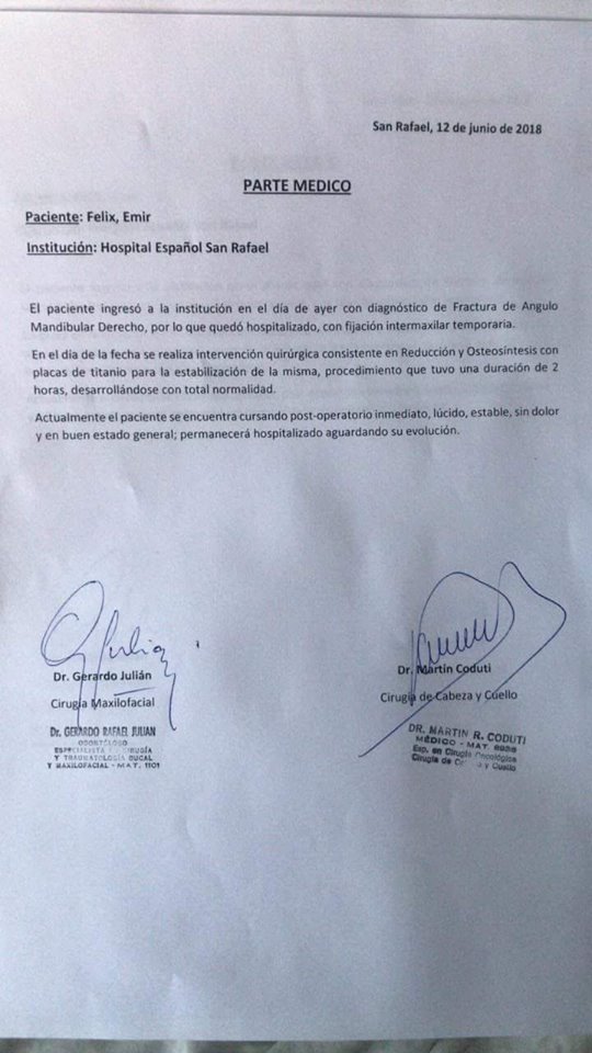 En dicho parte médico los especialistas comunicaron que Emir Félix ingreso al hospital Español en el día de ayer con diagnóstico de fractura de Ángulo Mandibular Derecho, por lo que quedó hospitalizado con fijación intermaxilar temporaria.