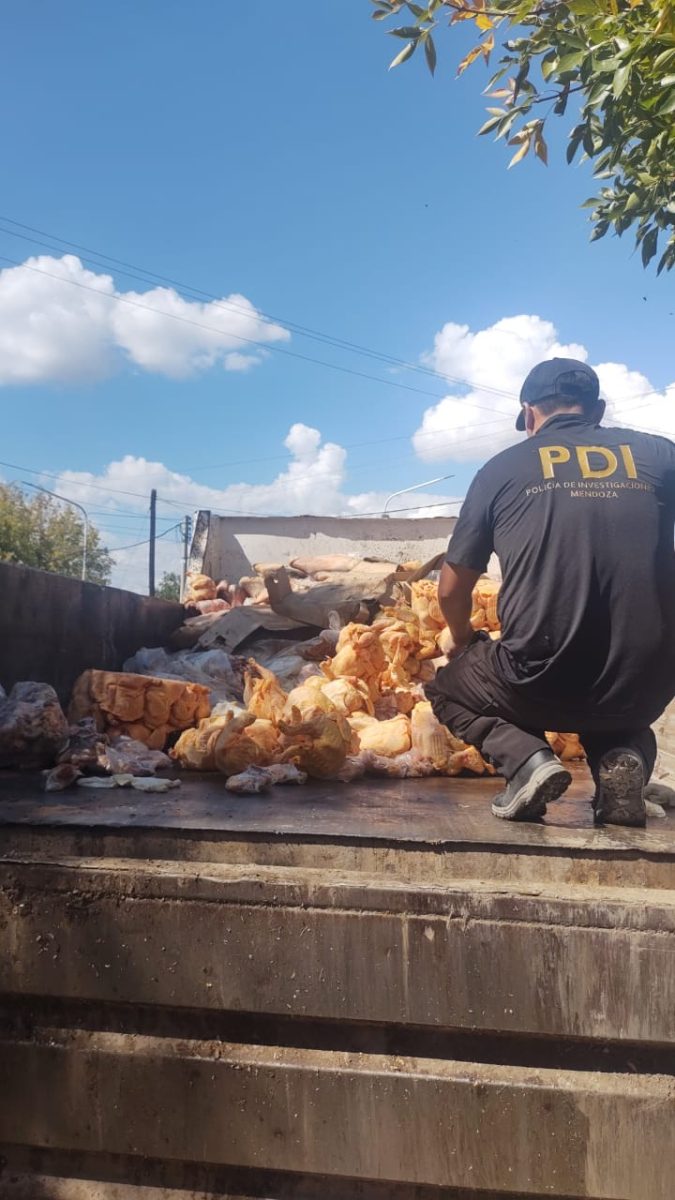 El contenido generó sospechas sobre una posible faena ilegal de guanacos, especie protegida en Mendoza. A partir de ese dato, la Policía de Mendoza identificó el vehículo y avanzó con tareas de inteligencia en San Carlos, que derivaron en dos domicilios vinculados. En esas tareas previas, un dato llamó especialmente la atención de los investigadores, es que en uno de los inmuebles se observó movimiento típico de carga y descarga de alimentos. En el lugar había una camioneta con caja refrigerada identificada para transporte de sustancias alimenticias y, además, un camión frigorífico que operaba sin ningún tipo de cartelería visible.
