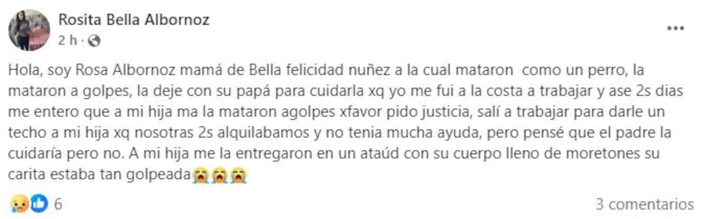 “La dejé con su papá para cuidarla porque yo me fui a la Costa a trabajar y hace dos días me entero que a mi hija me la mataron a golpes. Por favor pido justicia, salí a trabajar para darle un techo a mi hija porque nosotras dos alquilábamos y no tenía mucha ayuda, pensé que el padre la cuidaría pero no. A mi hija me la entregaron en un ataúd con su cuerpo lleno de moretones”, escribió su mamá, a través de un posteo en las redes.