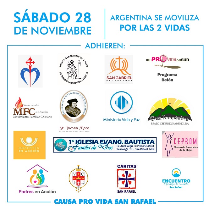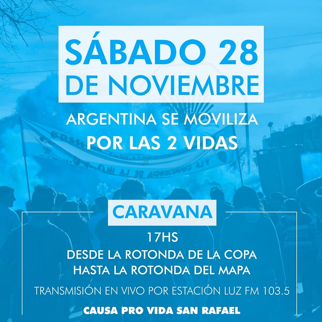Causa Provida San Rafael invita a toda la comunidad a la Caravana a favor de las dos vidas que se llevará a cabo el próximo sábado 28 de noviembre a las 17 horas. Partirá desde la Rotonda de la Copa para llegar a la Rotonda del Mapa. Durante la misma se podrá seguir la transmisión en vivo sintonizando Estación Luz 103.5.