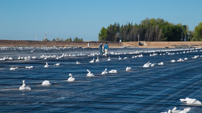 Uno de las formas de reutilización de esa membrana es como cobertura de techos. Y así la ven colocada los ingenieros de Irrigación cuando van a la localidad de Tres Porteñas en las viviendas de una conflictiva villa inestable cercana a los reservorios.