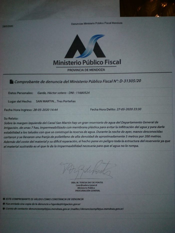La escasez de agua tiene su lado positivo para ladrones que esta semana robaron buena parte de la membrana plástica impermeable que cubre uno de los tres reservorios de agua que el Departamento General de Irrigación construyó en San Martín y fueron inaugurados el 10 de abril de 2019 por el entonces gobernador Alfredo Cornejo y el actual superintendente, Sergio Marinelli. Se trató de la Modernización de la Red Terciaria del Tramo Inferior del Río Mendoza (5ª y 6ª zonas de riego).